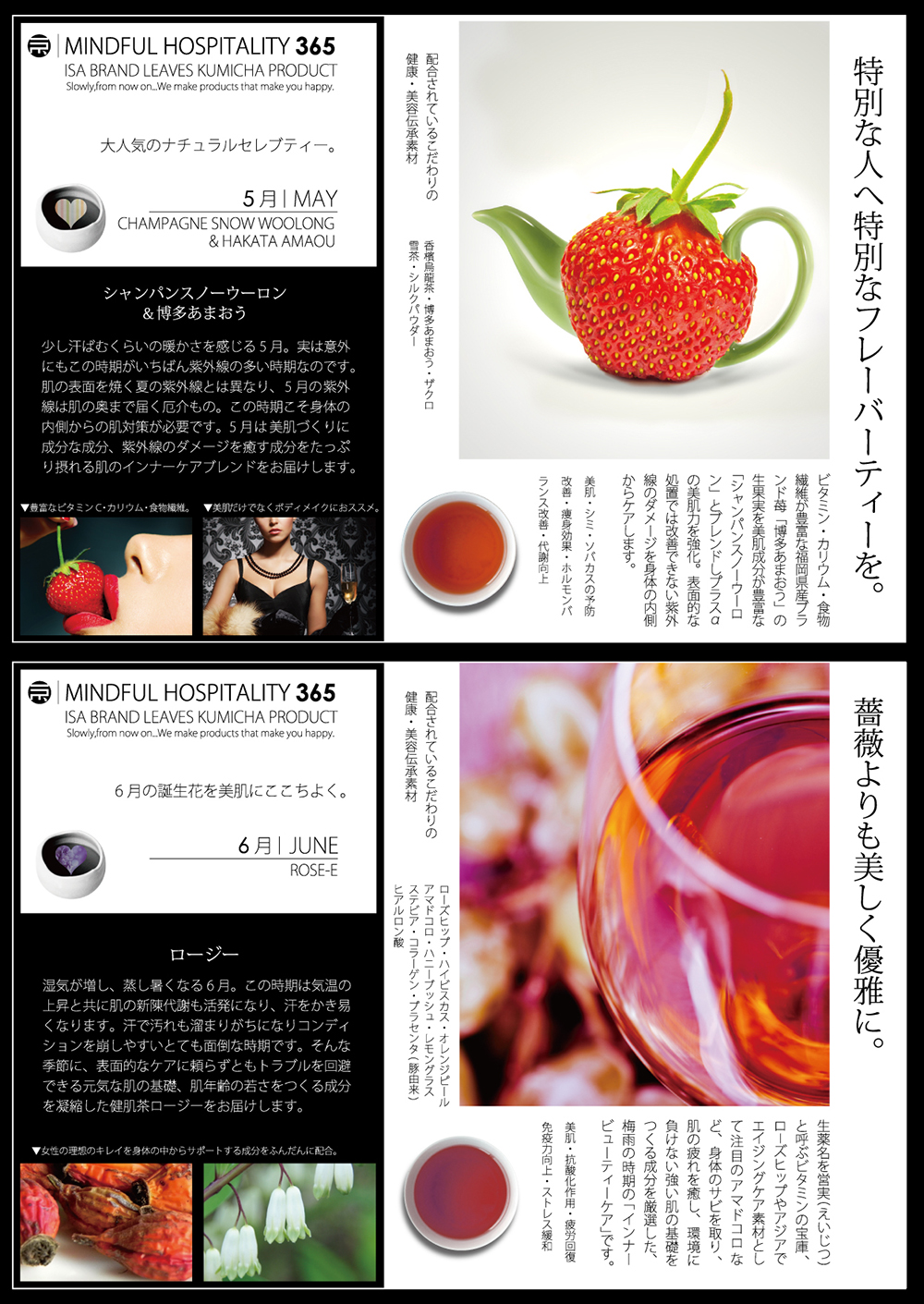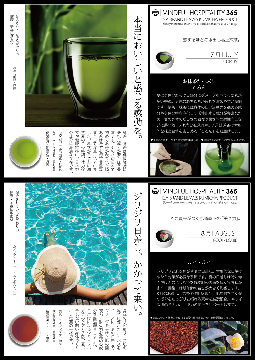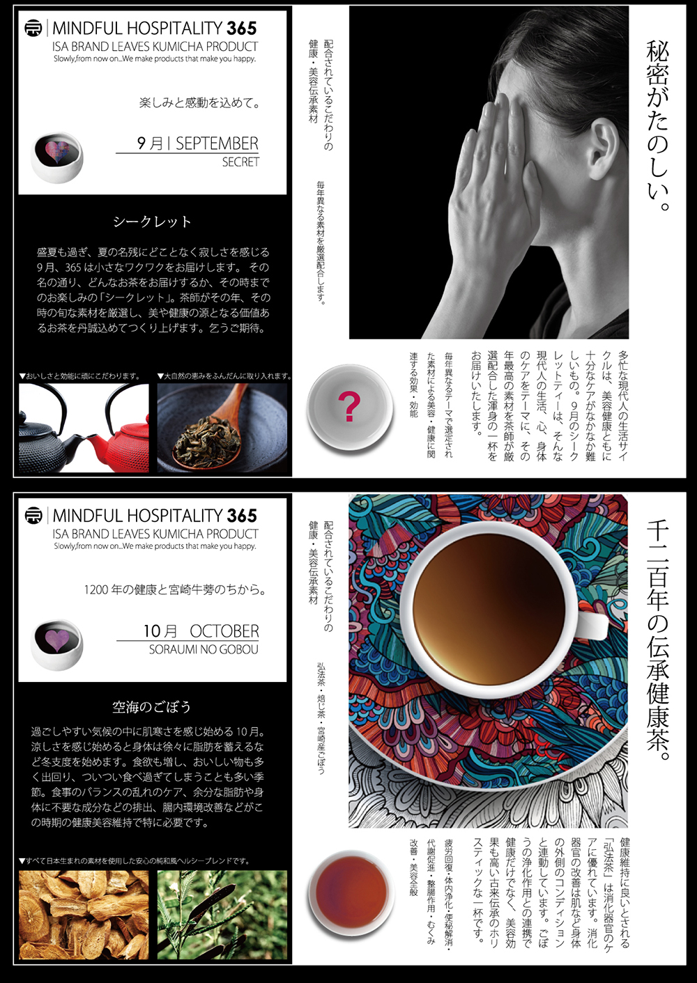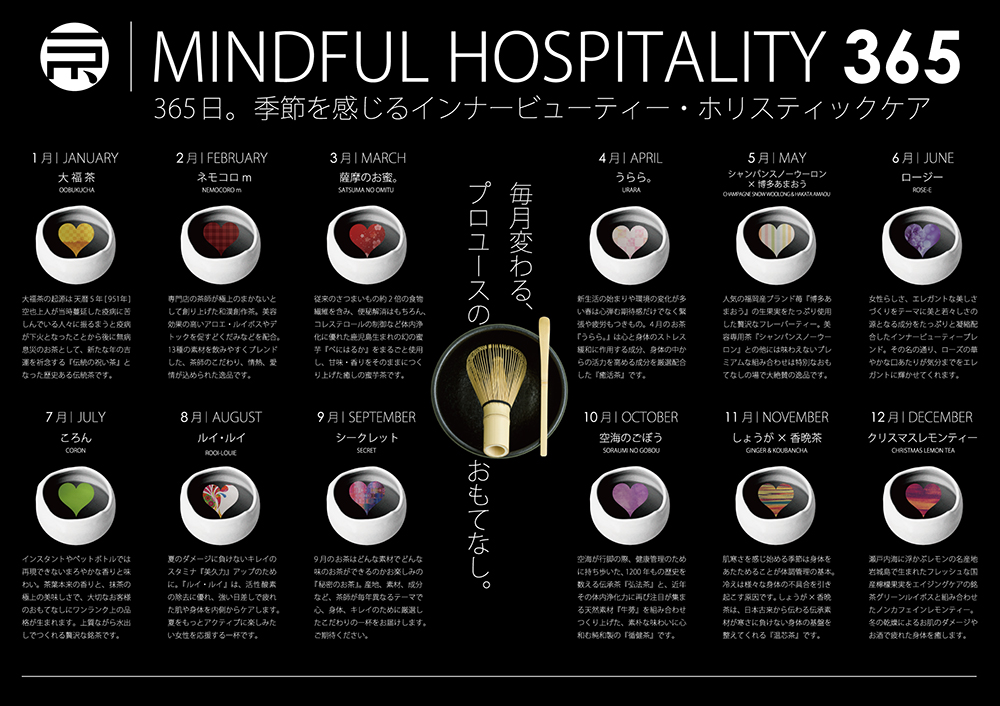 季節を感じるおもてなし。マインドフルホスピタリティ365は毎月季節のオリジナルティーをお届けするマンスリープロダクト。サロンでお客様へ提供するウェルカムティー用途の業務用仕様と、店頭販売用の店販仕様をご用意。素材や効能などの解説が入ったミニガイドや店頭ポップも付属で、スピーディーに導入いただけます。