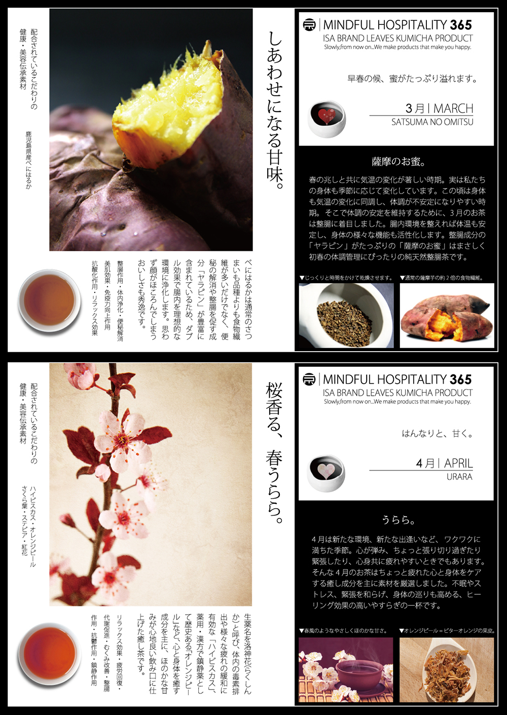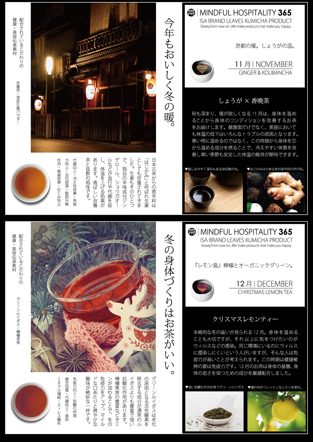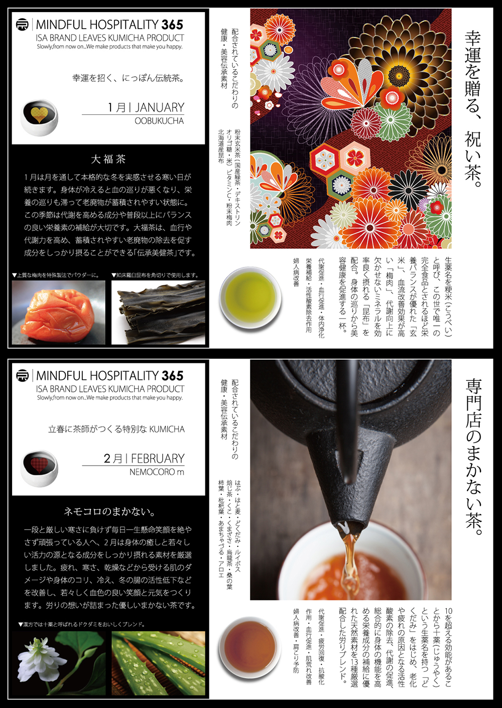 季節を感じるおもてなし。マインドフルホスピタリティ365は毎月季節のオリジナルティーをお届けするマンスリープロダクト。サロンでお客様へ提供するウェルカムティー用途の業務用仕様と、店頭販売用の店販仕様をご用意。素材や効能などの解説が入ったミニガイドや店頭ポップも付属で、スピーディーに導入いただけます。