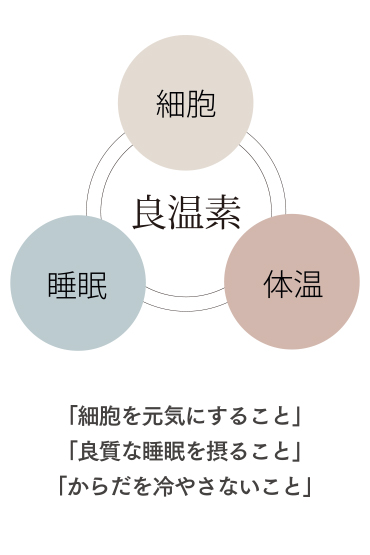 私たちの身体をつくっている37兆の細胞ひとつひとつが元気に整うことで初めて私たちの身体は本来あるべき健全なコンディションを手に入れることができます。年齢を重ねてもずっと美しく綺麗でいたい、いつまでも健康で笑顔でいたい、家族やパートナーにずっと元気でいて欲しい、私たち誰もがそう願っています。時代の進化と共に品質の高い施術や治療、ケアが簡単で身近になりましたが、その反面、利便性を追求する社会で楽な暮らしになり、良質な身体が失われているのが現実です。本来私たちに大切な、食習慣や睡眠、生活の質を高めることが無意識では難しくなった現代だからこそ、失われた本来の姿、本来の輝きを取り戻す暮らし、代替医療の観点から「良温素」を育む暮らしを届ける、それが私たちが届けたい「良温生活」です。